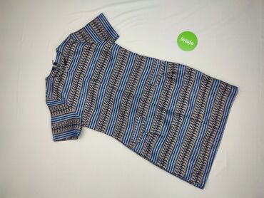 Sukienka damska Sinsay, rozmiar L - Fason: prosta, przed kolano, krótkie rękawy - Kolor: granatowy - Detale: kołnierzyk koszulowy i wykończenia rękawów w biało‑granatowe paski; zapięcie z tyłu na ...