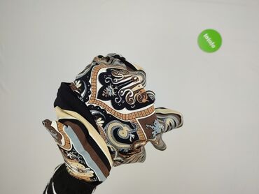 - Wzór: ozdobny, barokowy/ornamentowy z pasami; kolorystyka w tonach czerni, beżu, brązu i jasnego błękitu.