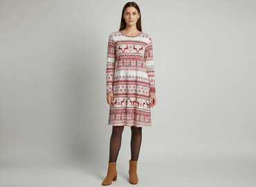 Sukienka damska świąteczna z długim rękawem. - Wzór: norweski/świąteczny – renifery, płatki śniegu, geometryczne pasy; kolor dominujący: czerwony, wzór biały. - Krój: dopasowana, długość przed kol...
