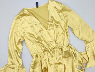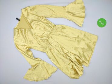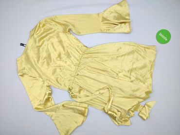 Sukienka damska w kwiaty – rozmiar S - Kolor: intensywnie żółty z niebiesko-białym, drobnym nadrukiem kwiatowym - Fason: kopertowy przód z wiązaniem w talii, krótkie rękawy z lekką falbanką - Dół:...