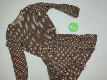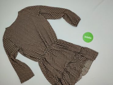 Sukienka damska mini w kropki, brązowa z białym wzorem - Fason: rozkloszowana, z falbanami na spódnicy - Rękawy: długie, lekko bufiaste - Dekolt/stójka: delikatna stójka z falbanką - Zapięcie: rzą...