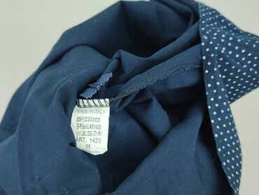 Granatowa sukienka w białe groszki, rozmiar M. - Krój koszulowy z kołnierzykiem - Długość midi, rozkloszowany dół - Długi rękaw z gumką przy mankiecie - Pasek do wiązania w talii + elastyczna tali...