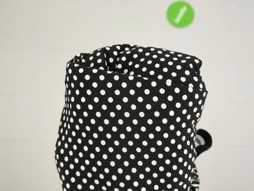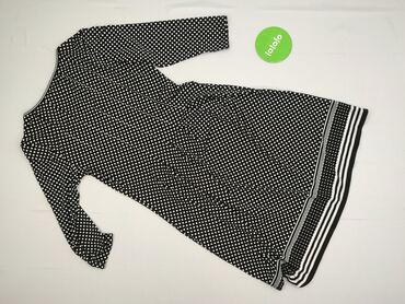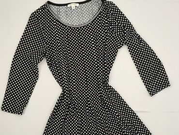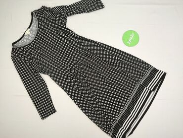 Sukienka damska w czarne tło z drobnym, białym, nieregularnym groszkiem. - Krój: dopasowany z marszczeniami po bokach, podkreślającymi talię; długość midi. - Rękaw: krótki. - Dekolt: okrągły. -...
