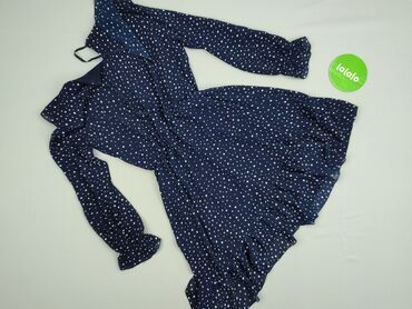 Granatowa sukienka w białe drobne kropki - Fason: rozkloszowany dół, talia podkreślona elastyczną gumką - Dekolt: z wiązaną kokardą - Rękawy: krótkie z delikatnymi falbankami - Długość: midi - Mat...Stan: