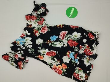 Czarna sukienka mini z krótkimi rękawami i białym kwiatowym wzorem. Charakteryzuje się dekoltem w kształcie litery V, który jest kopertowy, dodając sukience lekkości i dopasowania. W talii znajduje...