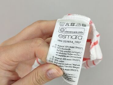 Sukienka Esmara – czerwono-biała, z nadrukiem w abstrakcyjne motywy przypominające koralowce. - Krój: prosta, wiązana w pasie paskiem z tej samej tkaniny; krótkie rękawy. - Dekolt/kołnierz: stójka...