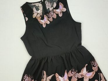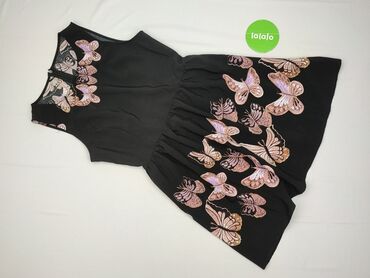 Sukienka damska bez rękawów, rozmiar M. - Kolor: czarny z wielobarwnym, kwiatowo‑motylim nadrukiem u dołu. - Fason: luźny, swobodnie opływający sylwetkę; długość midi. - Dekolt: stójka/halter, z...