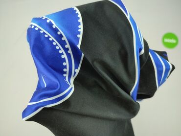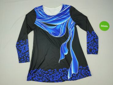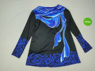 - Wzór: duża, graficzna aplikacja w intensywnych niebieskich tonach z białymi akcentami; na rękawach i dole efekt „panterki” w niebieskim kolorze