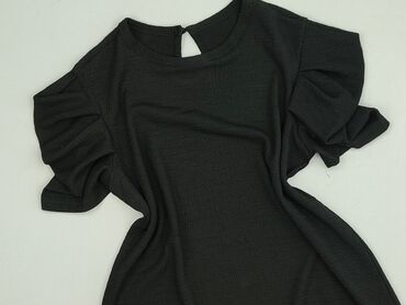 Czarna sukienka damska z lekkiej, zwiewnej tkaniny - Krój: luźny, trapezowy, długość mini/przed kolano - Dekolt: łagodnie zaokrąglony - Rękawy: krótkie, podwójnie falbaniaste, półprzezroczyste - D...