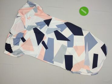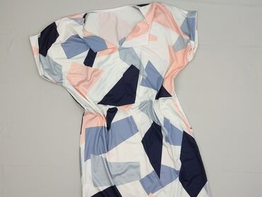 Sukienka damska z krótkim rękawem, rozmiar 44. - Fason: dopasowany, długość midi/przed kolano, okrągły dekolt. - Wzór: etniczne/geometryczne pasy i motywy tribal w odcieniach beżu, granatu, błęki...