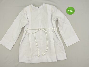 Biała sukienka/ tunika dziewczęca z koronką - Krój: prosta, lekko zwężana w talii, długość przed kolano - Dekolt: łódka z szeroką koronkową falbaną dookoła ramion - Rękawki: krótkie, w formie prze...