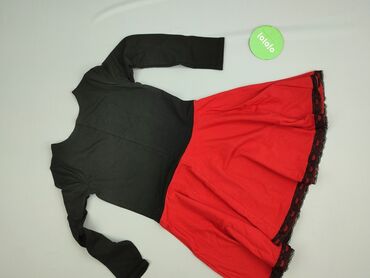 Sukienka dziewczęca z długim rękawem w kolorze czerwonym z czarnym wzorem „CC” i kropkami. - Fason: góra dopasowana jak bluza, dół z szeroką, marszczoną falbaną; długość za kolano (zależnie od wz...Stan: