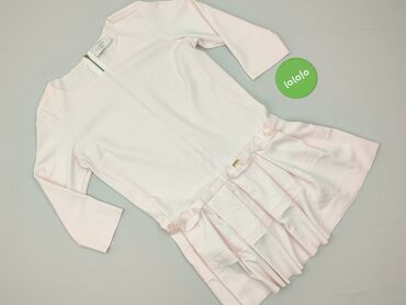 - Fason: prosta góra z okrągłym dekoltem, rękawy 3/4; dół z szerokimi, marszczonymi falbanami i dekoracyjną kokardką oraz niewielką złotą blaszką-logo przy pasie