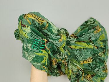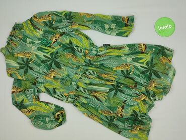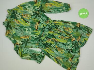 Sukienka dziewczęca z falbaną – tropikalny wzór liści - Krój: rozkloszowana, z elastyczną gumką w pasie; odkryte ramiona (hiszpanka) z szeroką falbaną biegnącą wokół dekoltu. - Wzór: kolorowe liśc...Stan: