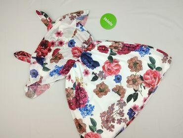 Sukienka w kwiaty – lekka i zwiewna - Kolor bazowy: biały, nadruk w drobne kwiaty w odcieniach różu, błękitu i zieleni - Krój: trapezowy/rozkloszowany, z falbanami na dole - Dekolt: okrągły - Ręka...