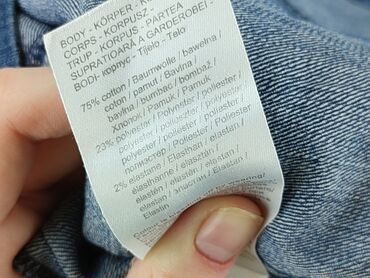 - Materiał: 75% bawełna, 23% poliester, 2% elastan – elastyczny denim, wygodny i dobrze dopasowujący się do sylwetki