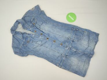 Sukienka jeansowa damska, rozmiar S - Krój: prosta, długość midi za kolano, zaokrąglone wykończenie dołu - Dekolt: okrągły z krótką listwą guzikową (3 metalowe napy) i delikatnym V - Rękawy: krótk...