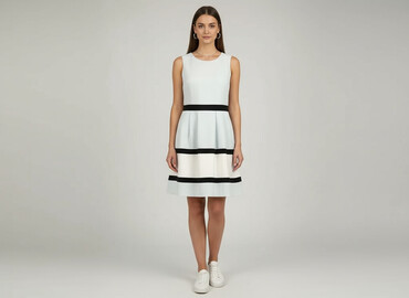 - Kolor: jasny ecru/biel z kontrastowymi, czarnymi pasami w talii i na dole spódnicy
