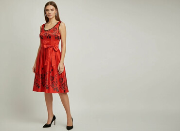 Sukienka koktajlowa na ramiączkach - Kolor: intensywna czerwień z czarnymi wstawkami po bokach - Fason: rozkloszowany dół z marszczeniami, podkreślona talia, górą na cienkich regulowanych ramiączka...