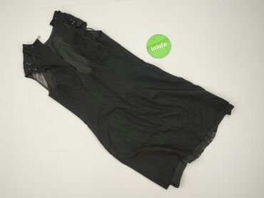 Sukienka damska koktajlowa, czarna, z połyskującymi aplikacjami - Krój: ołówkowy, dopasowany, długość do kolan - Dekolt: asymetryczny z półtransparentną wstawką z siateczki, ozdobiony drobnymi dże...