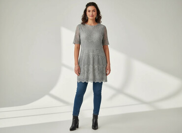 - Detale: liczne wstawki z różnymi wzorami koronki optycznie modelujące sylwetkę; wykończenia brzegów w fale