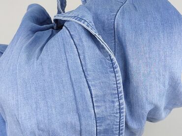 Sukienka jeansowa/denim, damska - Kolor: jasny niebieski (denim) - Fason: luźny, lekko trapezowy - Dekolt: okrągły - Rękawy: odkryte ramiona (cold shoulder) z szerokimi, falbanistymi mankietami - ...Stan:
