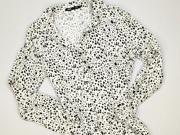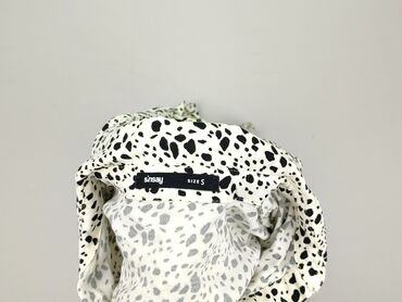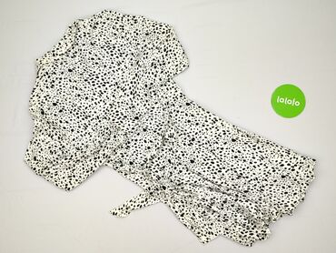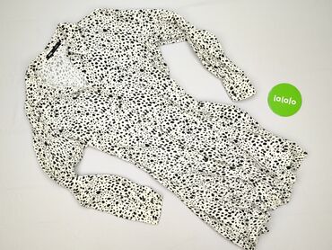 Sukienka Sinsay, rozmiar M - Krój: mini z kopertowym dekoltem w kształcie V, marszczeniem w talii i falbaną na dole; długie rękawy z gumką przy mankiecie. - Wzór: czarne tło w białe, nieregularne ...