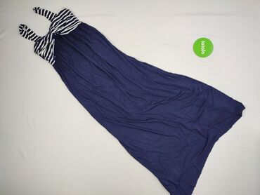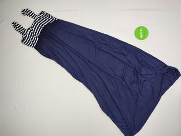 Sukienka damska maxi w paski - Fason: długa sukienka maxi, lekko rozkloszowany dół - Dekolt: okrągły - Ramiączka: cienkie, podwójne, krzyżujące się na plecach - Wzór: poziome granatowo-białe paski...