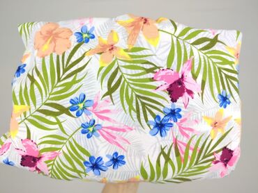 - Wzór: tropikalny nadruk na białym tle – zielone liście palmy oraz kwiaty w odcieniach różu, żółci, pomarańczu, niebieskiego i fioletu.