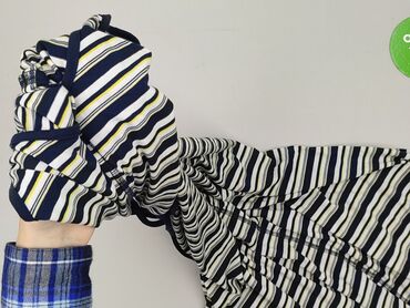 - Wzór: poziome pasy w kolorach granatowym, białym, żółtym i oliwkowym; granatowe lamówki przy dekolcie i pachach