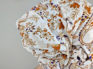- Lekka, zwiewna tkanina w białej bazie z roślinnym, orientalnym wzorem w odcieniach rudości, beżu i kobaltu