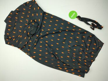 Sukienka damska z krótkim rękawem, ołówkowa, długość do kolan. - Kolor dominujący: czarny z czerwonym wykończeniem dekoltu i czerwono-biało-szarym panelem u dołu. - Wzór: geometryczne kółka i gro...