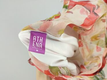 Na co dzieńPrzewiewna sukienka mini Athena Lifestyle w rozmiarze M, idealna na ciepłe dni. Charakteryzuje się bufiastymi rękawami o długości do łokcia i elastycznym dekoltem typu carmen, który można nosić na ramionach lub poza nimi. Materiał sukienki zdobi wyrazisty wzór w liście w odcieniach czerwieni, zieleni i żółci na jasnym tle, co nadaje jej świeży i letni wygląd. Fason z odcięciem w talii i lekko rozkloszowanym dołem zapewnia swobodę ruchów.