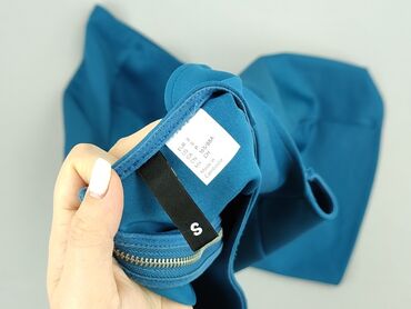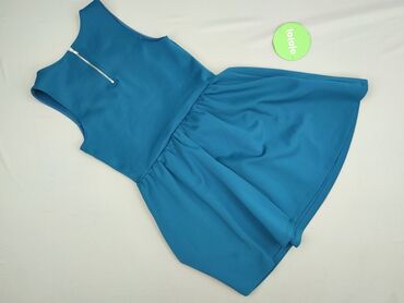 Damska sukienka w kolorze niebieskim, charakteryzująca się prążkowaną fakturą materiału i krótkimi rękawami. Dekolt jest okrągły, a na plecach znajduje się metalowy zamek błyskawiczny. Sukienka ma ...
