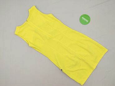 Sukienka bez rękawów w kolorze intensywnej żółci. - Fason: prosta, lekko trapezowa, długość do kolan (ok. midi/mini zależnie od wzrostu), dekolt typu halter z zabudowaną stójką. - Materiał: ażurow...