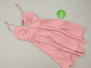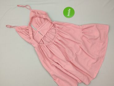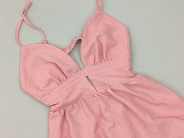 Sukienka STRADIVARIUS – różowa, mini - Rozmiar: L (EUR/USA), MEX 30 - Fason: rozkloszowana mini z odcięciem w talii i falbaną na dole - Rękawy: krótkie, bufiaste z gumką - Dekolt: kwadratowy z prz...