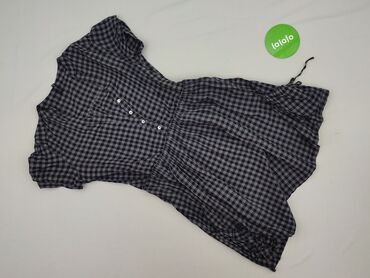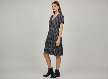 Krótki rękawSukienka mini damska z krótkim rękawem, w czarno-szarą kratę vichy. Charakteryzuje się dekoltem w kształcie litery V i zapięciem na białe guziki z przodu. W talii znajduje się elastyczne marszczenie, które podkreśla sylwetkę, a dół sukienki jest luźny i lekko rozkloszowany. Wykonana z bawełny, zapewnia komfort noszenia. Idealna na co dzień, na lato.