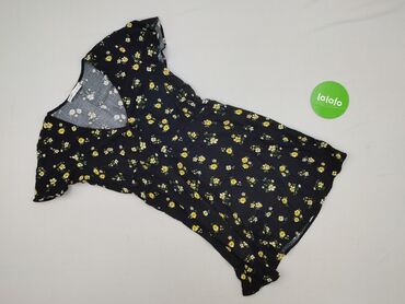 Sukienka damska Pull&Bear, rozmiar L - Kwiatowy wzór w róże na czarnym tle - Długość mini z falbaną u dołu - Dekolt w kształcie serka (V) - Długi rękaw - Taliowanie z delikatnymi marszczeniami pod...