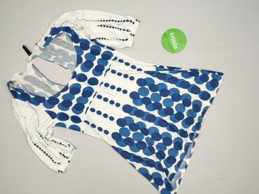 Sukienka damska midi w grochy - Fason: lekko rozkloszowana, długość za kolano - Dekolt: kopertowy/V z delikatnymi falbanami przy piersiach - Rękaw: krótki, lekko marszczony - Talia: elastyczna gum...Sukienka ONLY z dzianiny, wzór w niebieskie grochy na białym tle.