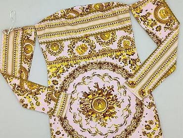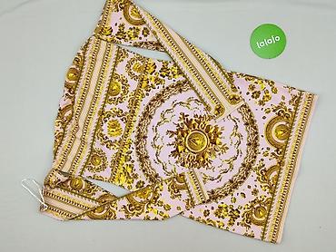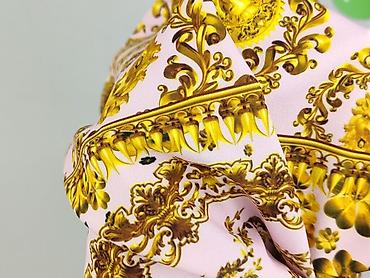 - Print: barokowy, bogato zdobiony w odcieniach złota na pastelowym różowym tle (centralny medalion, ornamentalne motywy)