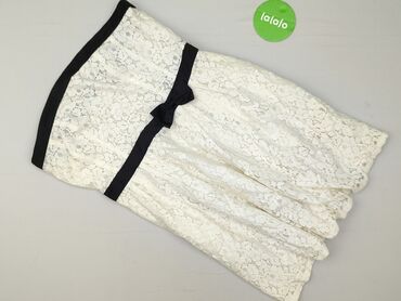 Sukienka damska z koronki, biała/ecru, romantyczny styl - Krój: lekko rozkloszowana spódnica, podkreślona talia z ażurową wstawką - Dekolt: w kształcie litery V z ozdobnymi, koronkowymi lamówkami ...Elegancka sukienka mini bez ramiączek, wykonana z delikatnej koronki w kolorze kremowym. Sukienka posiada czarne lamówki u góry oraz czarną wstążkę z kokardą w talii, która podkreśla figurę. Idealna na specjalne okazje, przyjęcia czy wieczorne wyjścia. Charakteryzuje się rozkloszowanym dołem, dodając stylizacji lekkości i dziewczęcego uroku. Zapinana z tyłu na dyskretny zamek błyskawiczny.