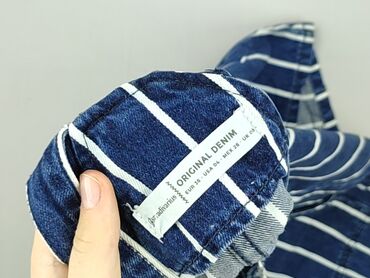 - Materiał: denim (jeans) w kolorze granatowym z białymi, pionowymi i poziomymi paskami