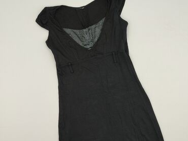 Sukienka damska, kolor czarny, prosty fason ołówkowy do kolan. Dekolt okrągły, rękawy 3/4. Z przodu dekoracyjna, ukośna lamówka w kolorze czerwonym biegnąca przez linię biustu. Tył gładki, bez zapi...