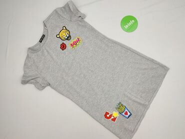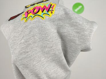 Na co dzieńSzara sukienka t-shirtowa z krótkim rękawem, ozdobiona naszywkami w komiksowym stylu. Na przodzie znajduje się naszywka z głową lamparta, ustami i dymkiem „POW!”. Dodatkowo, na dole sukienki umieszczone są naszywki z frytkami i czerwoną cyfrą 5, co dodaje jej unikalnego charakteru. Prosty krój i okrągły dekolt zapewniają komfort noszenia. Idealna na co dzień, do stworzenia swobodnych i oryginalnych stylizacji.
