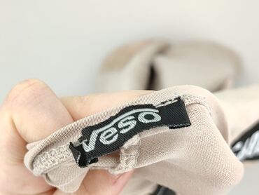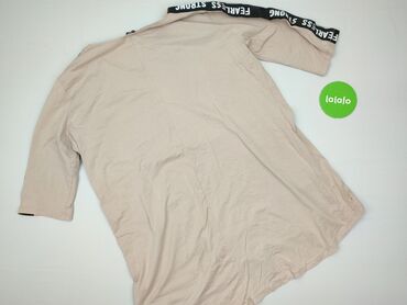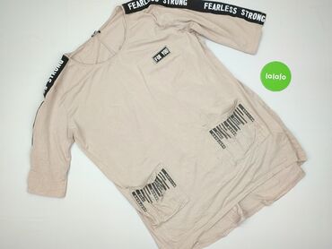 Rękaw 3/4Sukienka tunika damska w kolorze beżowym, z krótkim rękawem i okrągłym dekoltem. Charakteryzuje się czarnymi, ozdobnymi taśmami z napisem "FEARLESS STRONG" wzdłuż ramion oraz naszywką "FOR YOU" na wysokości klatki piersiowej. Tunika posiada praktyczne kieszenie z nadrukiem, co zwiększa jej funkcjonalność. Luźny krój zapewnia komfort noszenia. Idealna na co dzień, do noszenia jako sukienka lub dłuższa tunika.