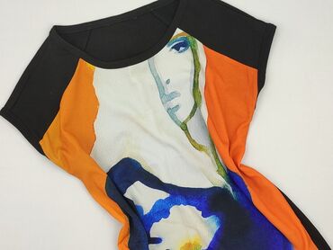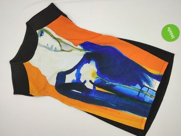 Sukienka damska z artystycznym nadrukiem - Fason: prosta, ołówkowa, długość do kolan - Rękaw: krótki - Dekolt: okrągły z czarną lamówką - Rozmiar z metki: 4 - Materiał: cienka, lekka tkanina o del...