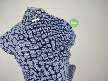 Sukienka damska z krótkim rękawem, wzór w duże, nieregularne plamy w stylu animal print (kremowe na granatowym tle). - Fason: prosta, lekko rozszerzana ku dołowi; długość przed kolano - Dekolt: w ...