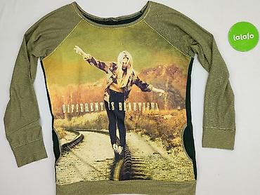Zielona bluza damska LHD by lesson, rozmiar S/M. Model z miękkiej dzianiny w melanżowej zieleni, z długim rękawem i ściągaczami przy dekolcie, mankietach i dole. Z przodu duży, ażurowy aplikowany m...