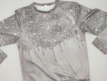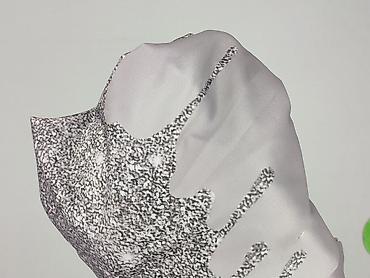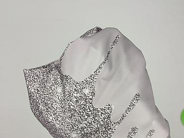 - Wzór: srebrzysty efekt brokatu/gwiezdnego pyłu z motywem „spływających” kropli; dół, mankiety i dekolt w tym samym nadruku