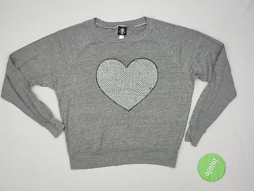 Szara damska bluza z długim rękawem, rozmiar S. Model z raglanowymi rękawami i elastycznymi ściągaczami przy dole oraz mankietach. Z przodu duże serce wyszywane gęsto błyszczącymi dżetami, obwiedzione ciemniejszymi kryształkami – efektowny, połyskujący akcent.